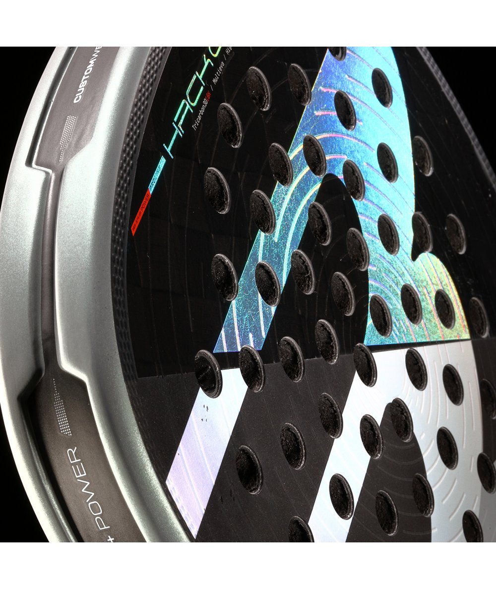 La distribución de agujeros en una pala de pádel desempeña un papel importante en el rendimiento, influenciando factores como el control, la salida de la pelota o la potencia. El nuevo patrón de agujeros en la línea Hack 04 se ha rediseñado con un formato de círculos concéntricos que permite una distribución más equilibrada, una mayor flexibilidad en la cara de la pala, y con ello una mayor salida de bola y un punto dulce más grande.